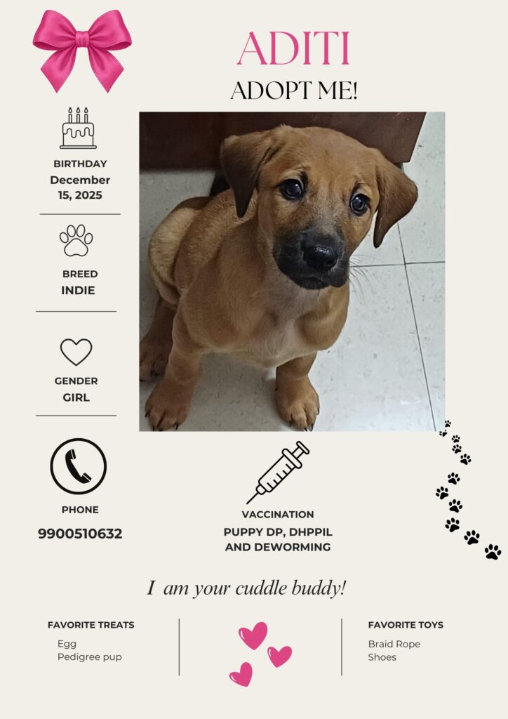 I am Aditi, with ears that perk up at every sound and a tail that never stops wagging, I am the epitome of puppy joy, perfect blend of playful energy and sweet affection.