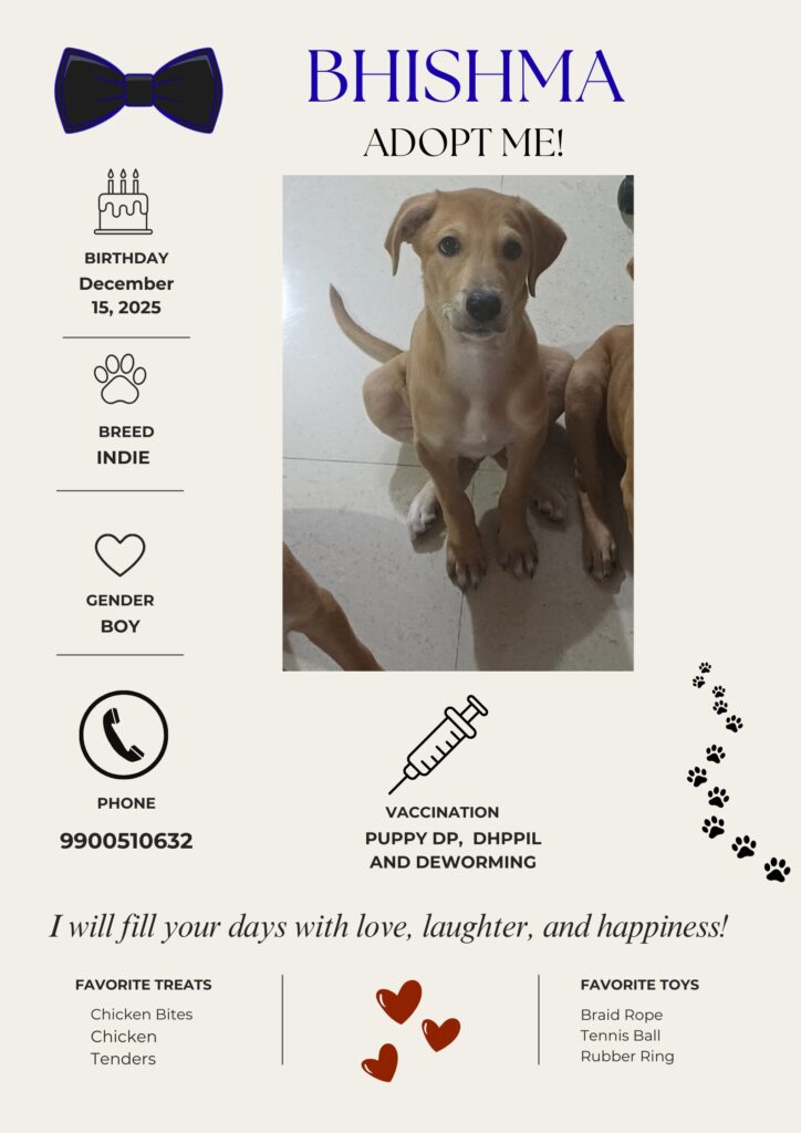 I am Bhishma, I am a little gentleman who is a bundle of pure joy and boundless energy. With my soft coat fur, floppy ears, and an unstoppable tail wag, I bring sunshine into every room.