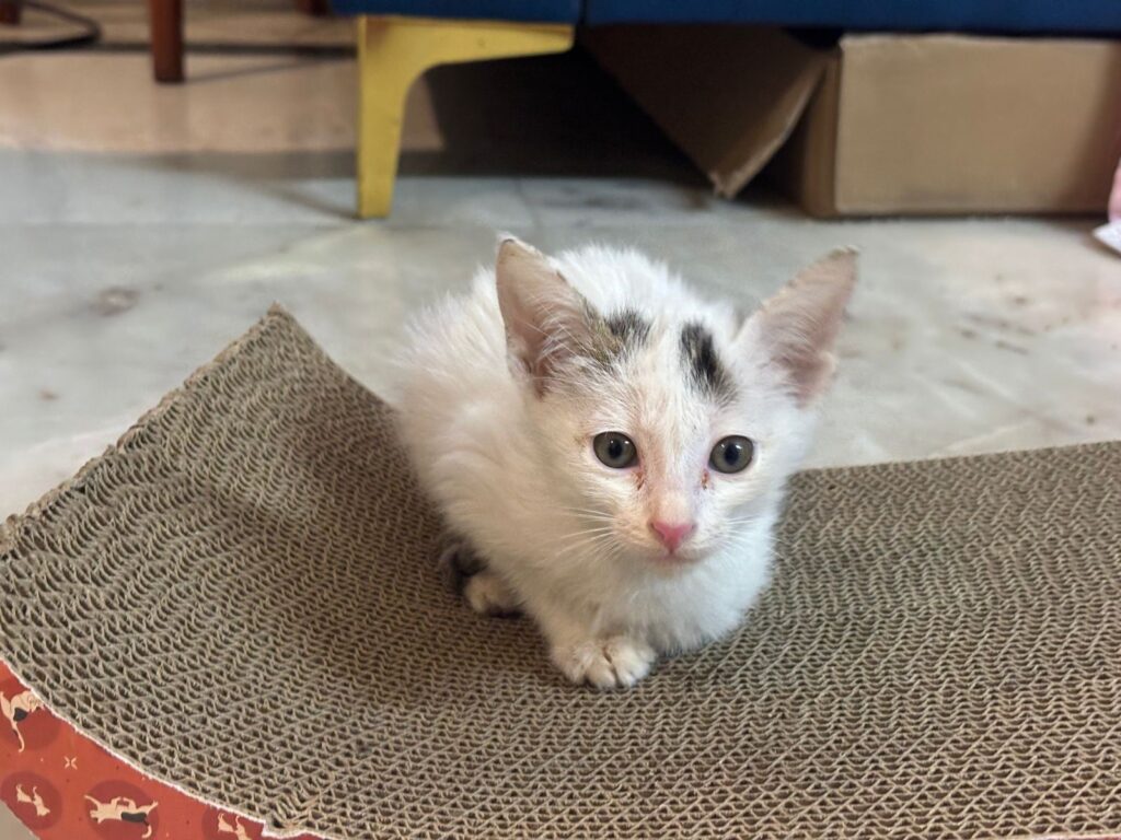 DOVE is beautiful inside out .She is pristine white with dark accent on the crown of her little head. Around 50 days old .She has rescued when she was a month old from a residential complex in GURGAON.We are looking for a loving family in GURGAON. Balcony netting is absolutely necessary and adopter needs to sign agreement. Contact only if you LOVE cats , willing to invest in safety and upkeep of a living tiny creature for a lifetime .She has been dewormed, vaccinated with 1 st shot of Felocell / Tricat .She has been rescued with 3 other siblings hence we would encourage paired adoption , however we are also open to single adoption. Refer Instagram profile @swagatarescues or DM / call 989904740/9163377203 to connect