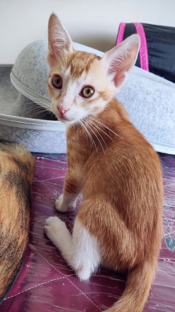 This charming little ginger boy was born on July 25th to a rescued queen cat I’d been fostering at home. He’s healthy, playful, curious, and full of cuddly energy. He’s already eating kitten food and using the litter box like a pro.